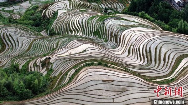 The Longji Terraces in Longsheng, Guilin, Guangxi Zhuang autonomous region, have entered their busy summer planting season. Villagers are plowing fields and transplanting rice seedlings, creating a lively scene across the multilayer terraces.