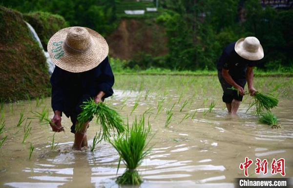 Farmers work diligently to transplant rice seedlings. [Photo/China News Service]